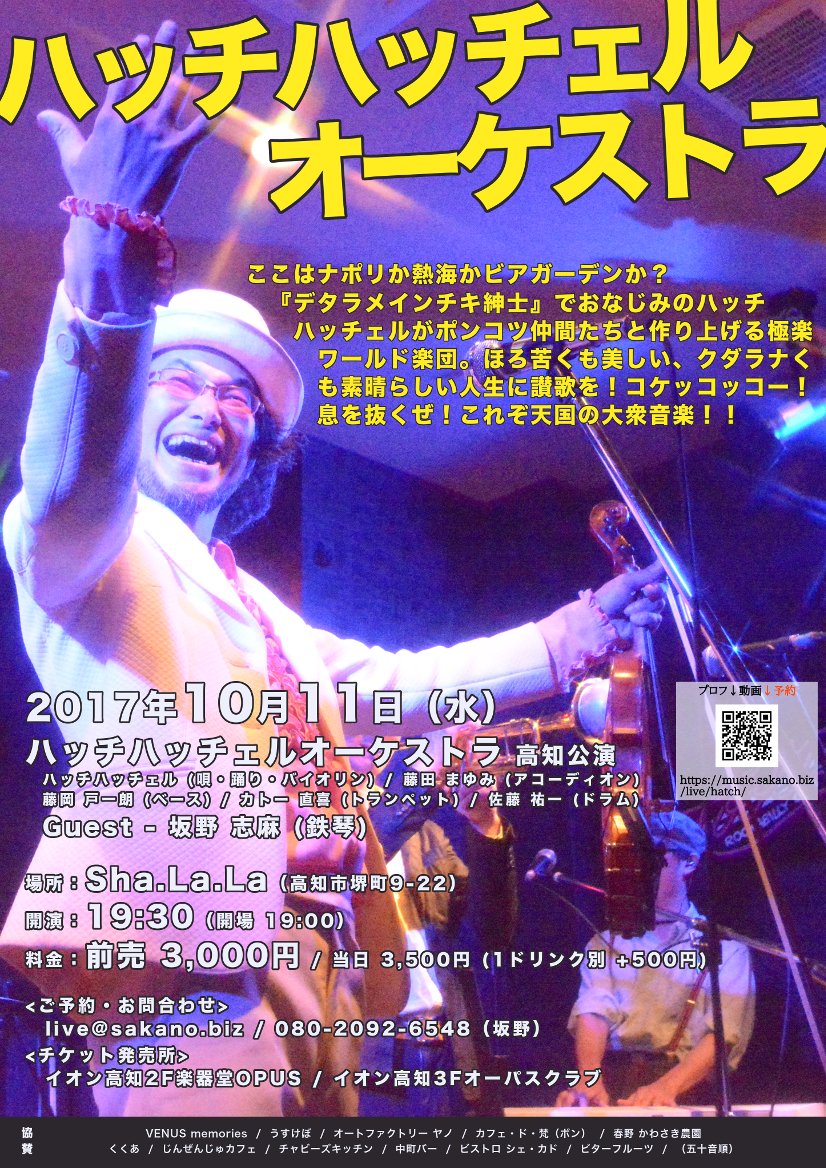 メンバー:ハッチハッチェル (唄・踊り・バイオリン)、藤田 まゆみ (アコーディオン)、藤岡 戸一朗 (ベース)、カトー 直喜 (トランペット)、佐藤 祐一 (ドラム)