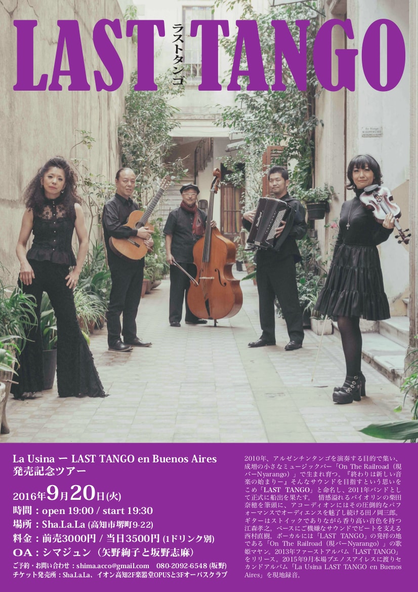 単身ブエノスアイレスに渡りフェルナンド・スアレス・パス氏のもと研鑽を積み、さらに現地でソロアルバムも制作した、情感溢れるバイオリンの柴田奈穂を筆頭に、アコーディオンには旅を愛し、その圧倒的なパフォーマンスでオーディエンスを魅了し続ける田ノ岡三郎。ギターには、かつて志賀清氏や藤沢嵐子氏のバンドに在籍経験を持ち、ストイックでありながら香り高い音色を持つ江森孝之。ベースにご機嫌なサウンドでビートを支え、上々颱風でも活躍する西村直樹。ボーカルには、「LAST TANGO」の発祥の地である「On The Railroad(現バーNyarango)」の歌姫マヤン。
